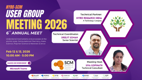 Join us for the Nyro-SCM User Group Meeting 2026 on 12th & 13th February 2026 in India, your premier event for Amsterdam Modelling Suite (AMS) users. This online gathering unites computational chemists, materials scientists, and industry experts to explore cutting-edge molecular and materials modelling. Discover AMS 2026 updates, trending topics in materials science, polymers, batteries, and solid-state simulations, plus hands-on workflows for real-world applications.